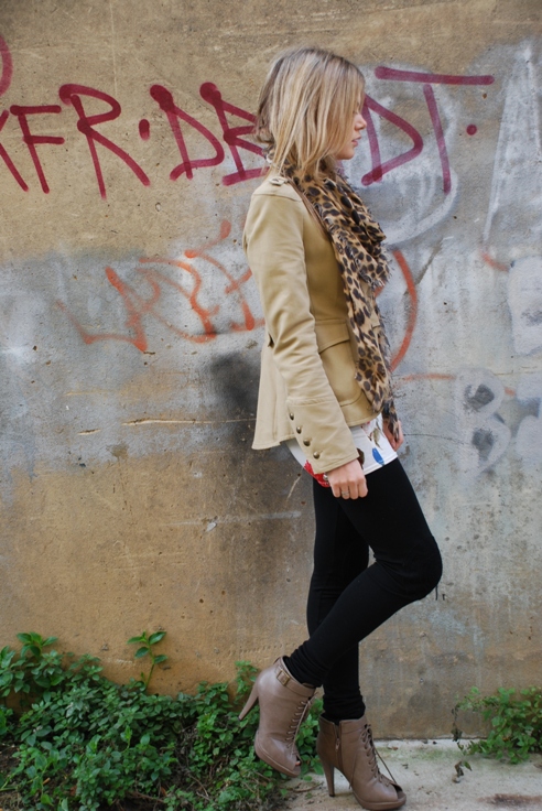 This outfit is what I call imports anonymous. On my recent trip to Dubai and Europe I made a few… just a few purchases (OK, I may or may not have bought an extra suit case to get my purchases home, and may or may not have shipped a box full of shoes back from London.. who me??? never!) this outfit was built from my travels; Forever 21 booties from Dubai, Zara military blazer London, with a mix of online shopping; Topshop dress, McQueen scarf (as mentioned earlier posts ago) and my Antonia Goy leggings from Cecylia Boutique.
