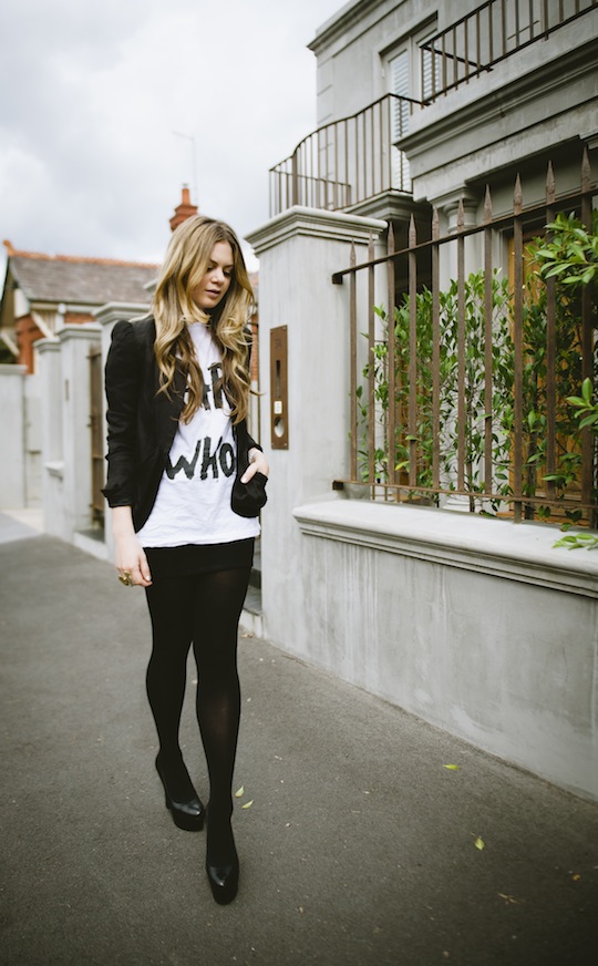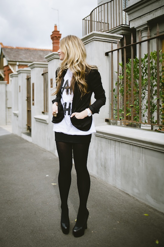 Rocking the black and white is so easy and so strong. Opaque stocking make my mumma legs look a lot skinnier than what they are and finishing off with the black platform YSL’s elongates them. You know I love my t-shirts and for those that are newbies to WWKD.com you won’t know the little story behind this Karl Who? tshirt but to make a long story short, I went all the way to Singapore to get it.