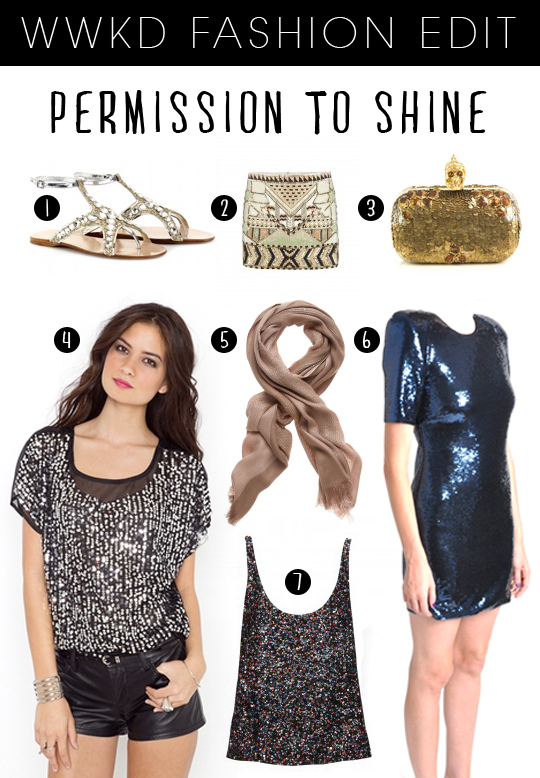 1. Miu Miu Glitter Sandals EUR 415 (BUY HERE) 2. All Saints Newaz Skirt GBP175 (BUY HERE) 3. Alexander McQueen Clutch GBP 1,055 (BUY HERE) 4. Nasty Gal Shattered Sequin Top $48 (BUY HERE) 5. Forever New Maggie Two Tone Sequin Scarfe $24.99 (BUY HERE) 6.Camilla & Marc Roma Dress $444.99 (ON SALE BUY HERE) 7.Sass & Bide Walk the Line Cami $450 (BUY HERE)