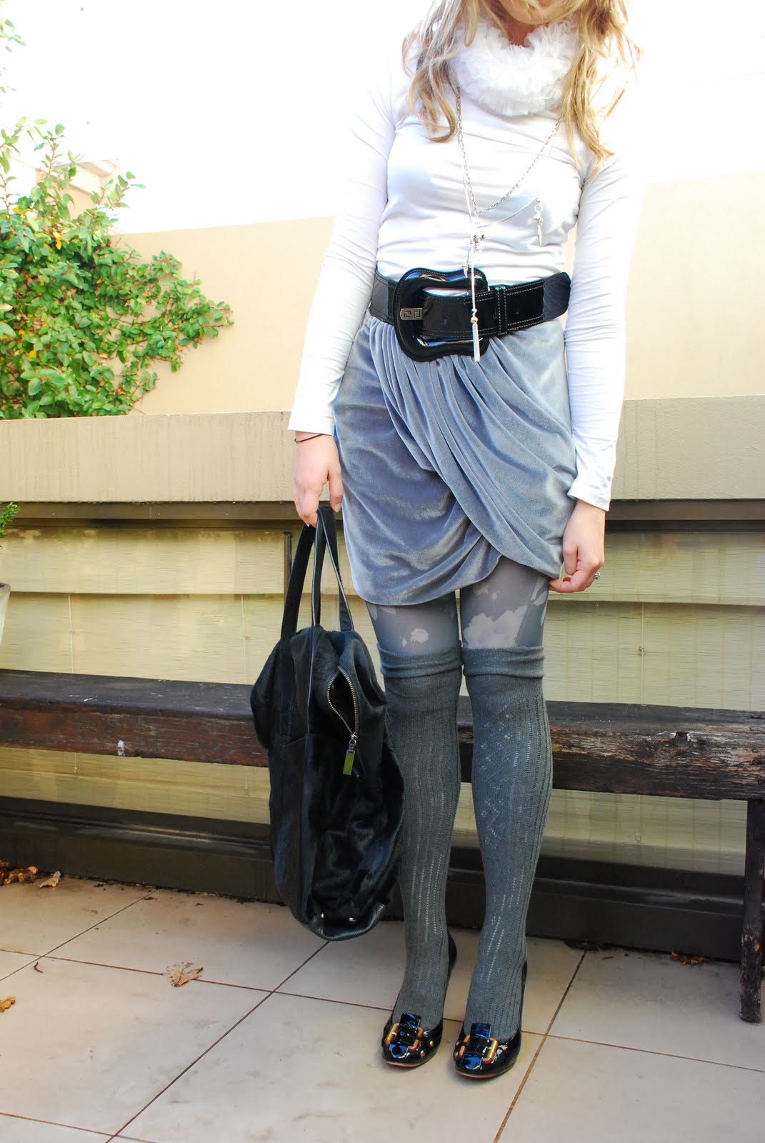 Karla Spetic grey skirt, White ruffle neck top by Gloria Coelho from BUE Melbourne, Topshop stockings, Country Road Socks, Chloe wedges, BOSS BLACK Ponyfur bag, GAS necklace with cross, Fiorina neckpiece, Fendi B Belt